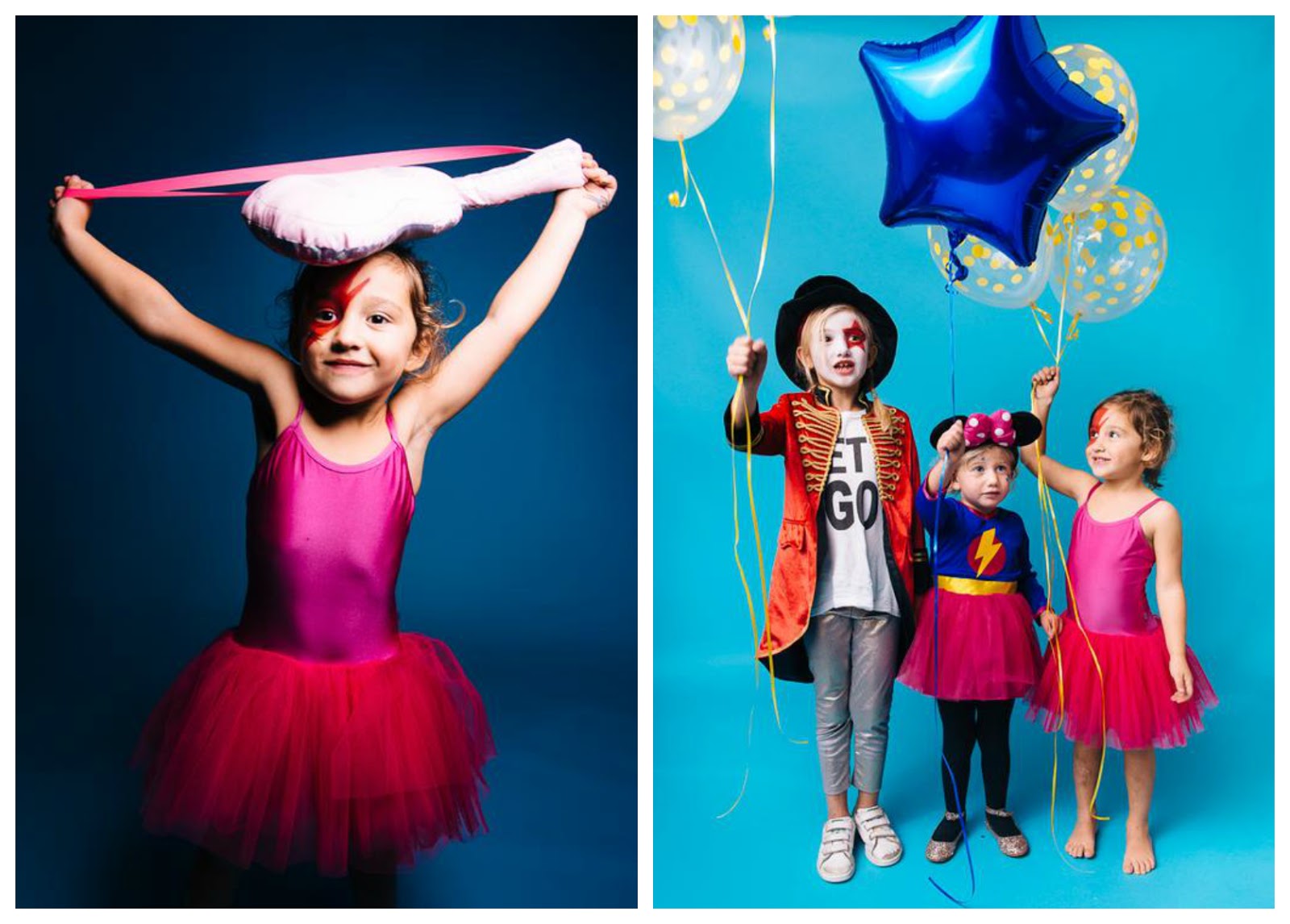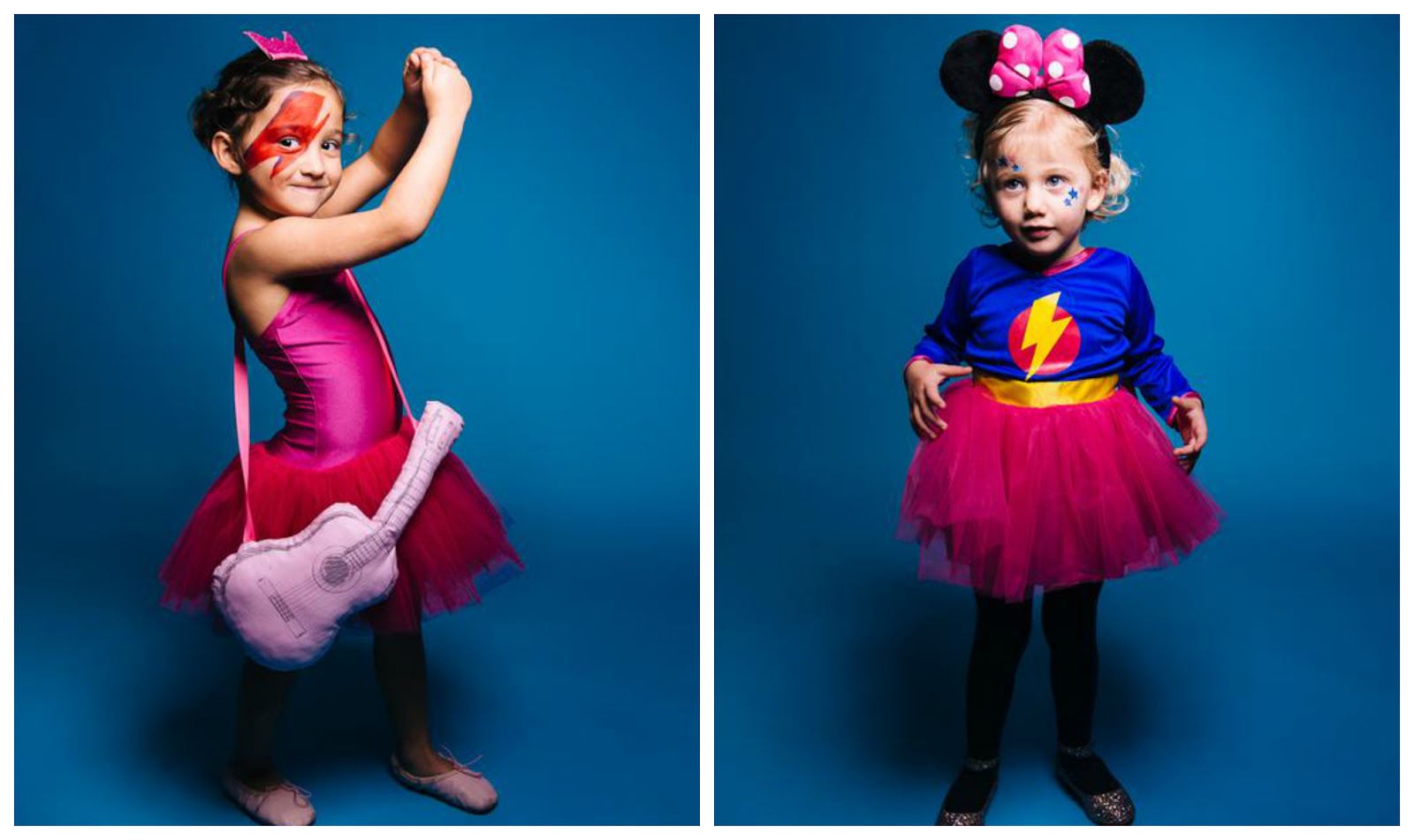 Se David Bowie gostava de ser irreverente, nós quisemos mostrar que bailarinas podem arrasar com um tuto fucsia e uma guitarra (esta guitarra de pano do Atelier da Tufi é demais e foi escolhida de propósito para esta sessão). Que a Supermulher pode ser a Minnie de sapatos brilhantes e com a cara mais amorosa do mundo. E que os domadores de Leões podem cantar Rock e ter um charme que não há igual. O pai foi um espectáculo e vestiu a sua pele na perfeição, um verdadeiro Rock Star e eu mostrei que fadas não têm de ter cabelos loiros compridos, nem lisos certinhos e continuam boazinhas a fazer magias com a sua varinha, mesmo com um blusão de cabedal vestido. We rock…
