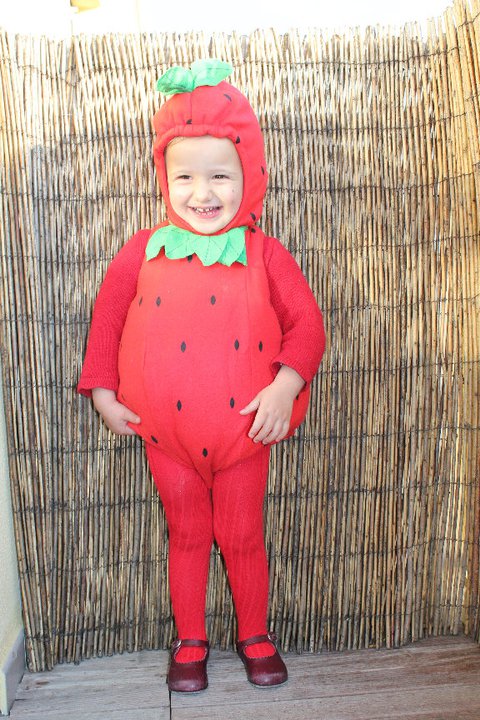 A C. Pequenina vai vestir o fato de morango que já foi usado pela irmã e pela prima E.. Este foi um fato giro que comprei na loja de brinquedos do Campo Pequeno e tem dado para todas. Aposto que ainda vamos ver mais uma C. com ele vestido, é um amor e é do mais prático que pode haver para elas com esta idade.