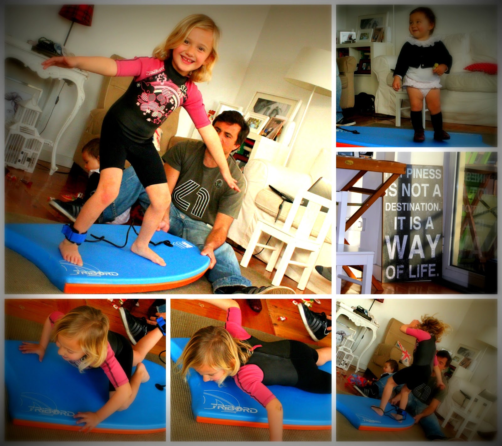 ps – Quando chega o fim de semana e a C. grande vê o H. sair com a prancha de surf, pede-lhe várias vezes para ir também. Para ela, se o pai vai e não tem frio, ela também pode ir e pode fazer. Para tentar animá-la o H. lá resolveu ir buscar o mini-fato de surf que a tia S. lhe ofereceu, a prancha e deu-lhe uma aula em terra, aqui mesmo no chão da sala…foi divertido e quase tão bom como se tivesse sido na praia, aliás com os dias péssimos que têm estado foi bem melhor, garantidamente. Pelas gargalhas que deu, gostou e já pediu para repetir, ou seja com tão pouco se consegue contentar as crianças, nós às vezes é que não temos paciência, porque ideias giras e acessíveis pelos vistos não faltam.