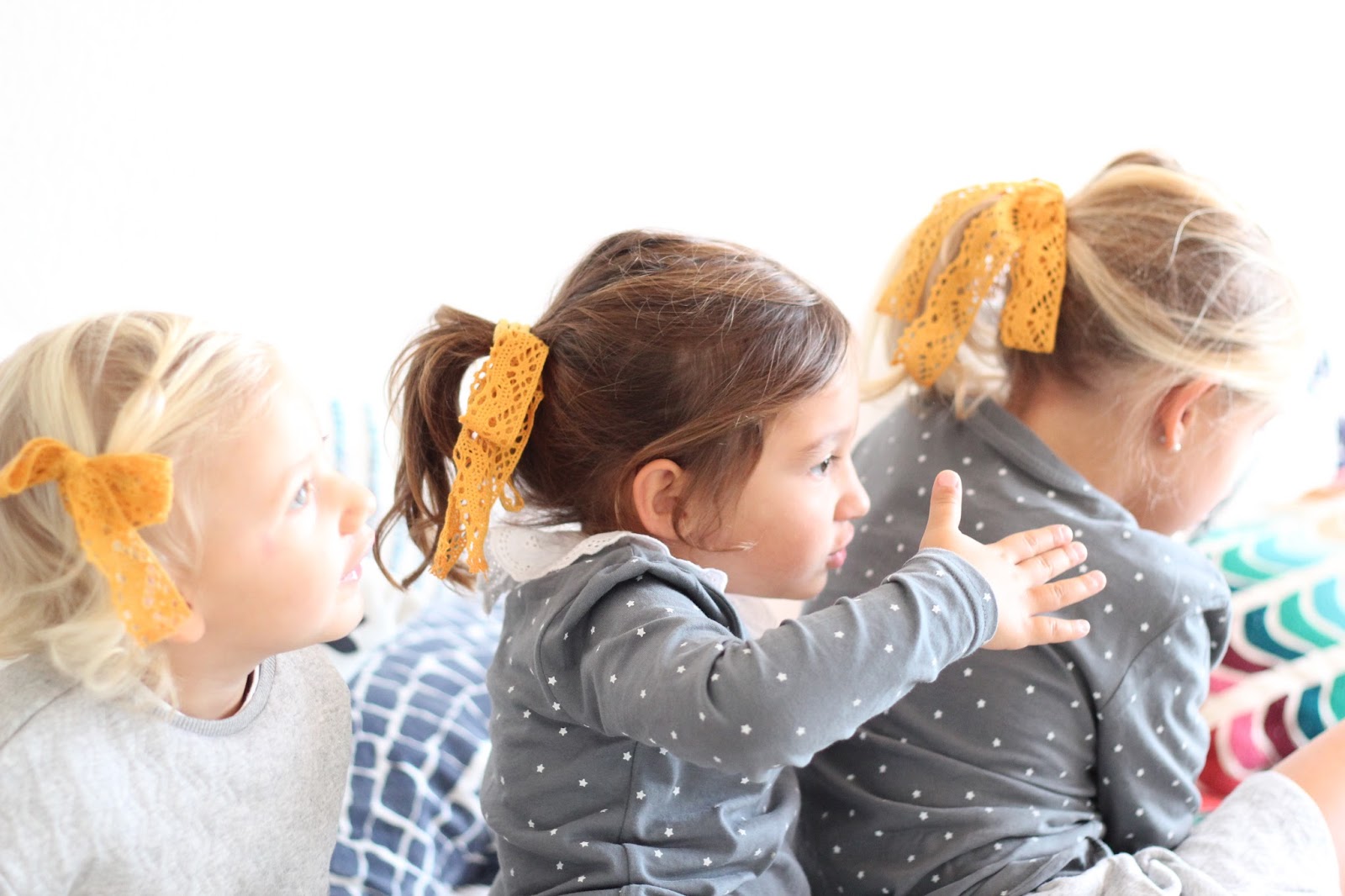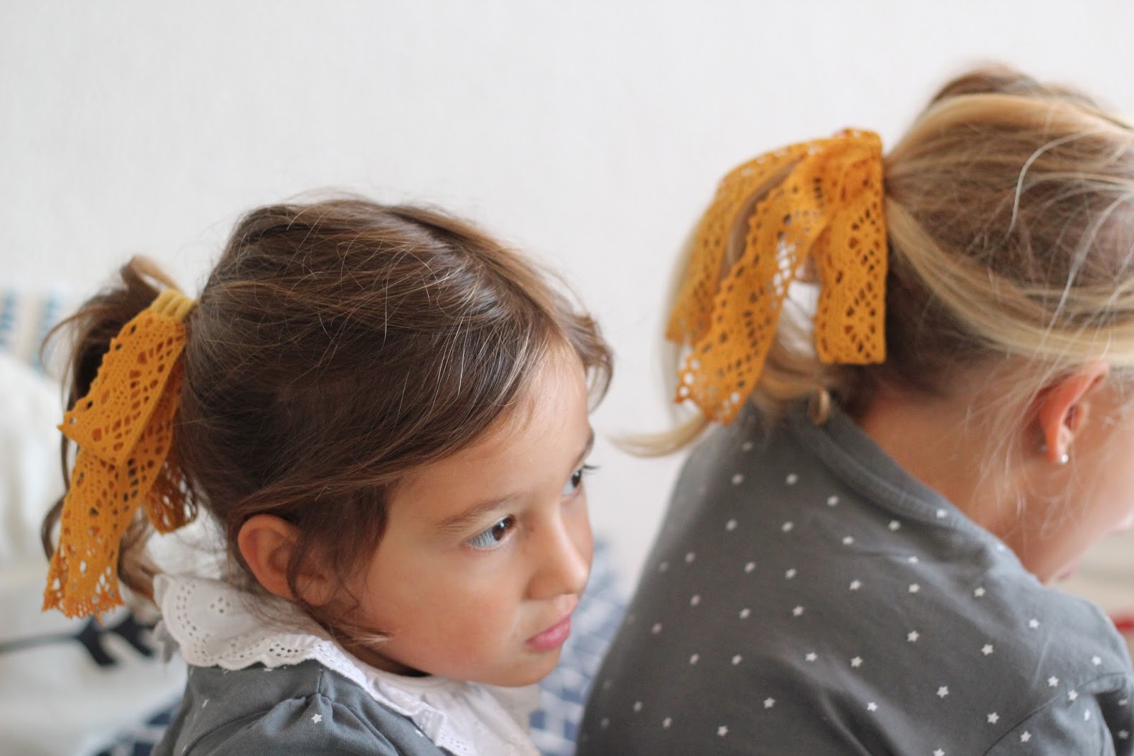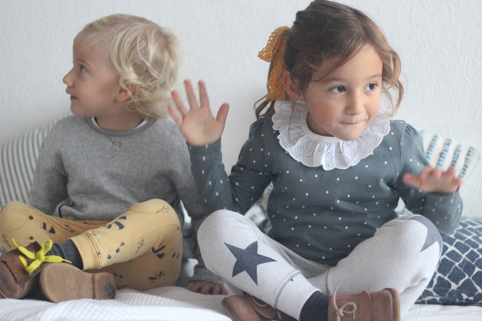 Hoje o mood das roupas delas foi amarelo e cinzento, porque o dia estava feio, as miúdas estão em casa de férias intercalares e só pedem sol para ir brincar ao jardim. Vá lá S. Pedro, dá para lhes fazer a vontade? Elas até têm sido meninas bem comportadas, as birras são algumas, mas nada comparado com há uns meses atrás e as professoras dizem que elas estão atentas e se portam bem nas aulas, por isso, manda lá uns dias sem chuva para programas divertidos de Outono, pode ser?