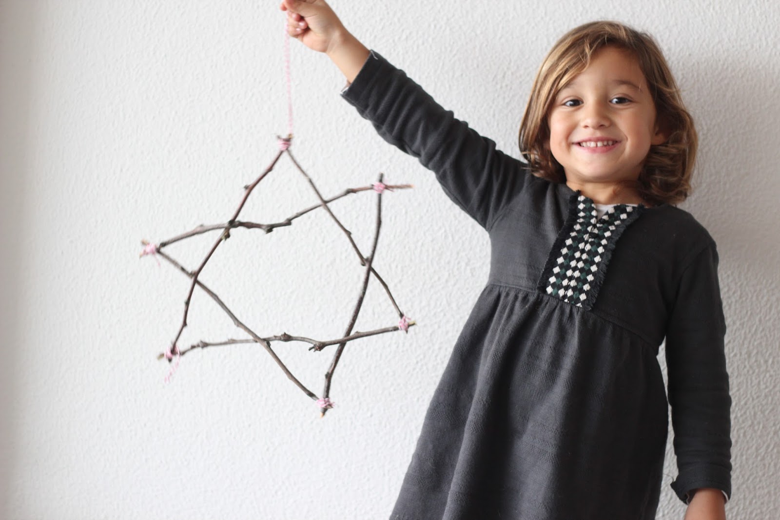 Hoje, depois de ter praticamente tudo comprado e organizado para amanhã, chamei-as e as 4 fizemos 3 estrelas. Uma ajudava a cortar a corda, a outra ajudava a segurar os paus e a Caetana olhava muito atenta e dava apoio moral.