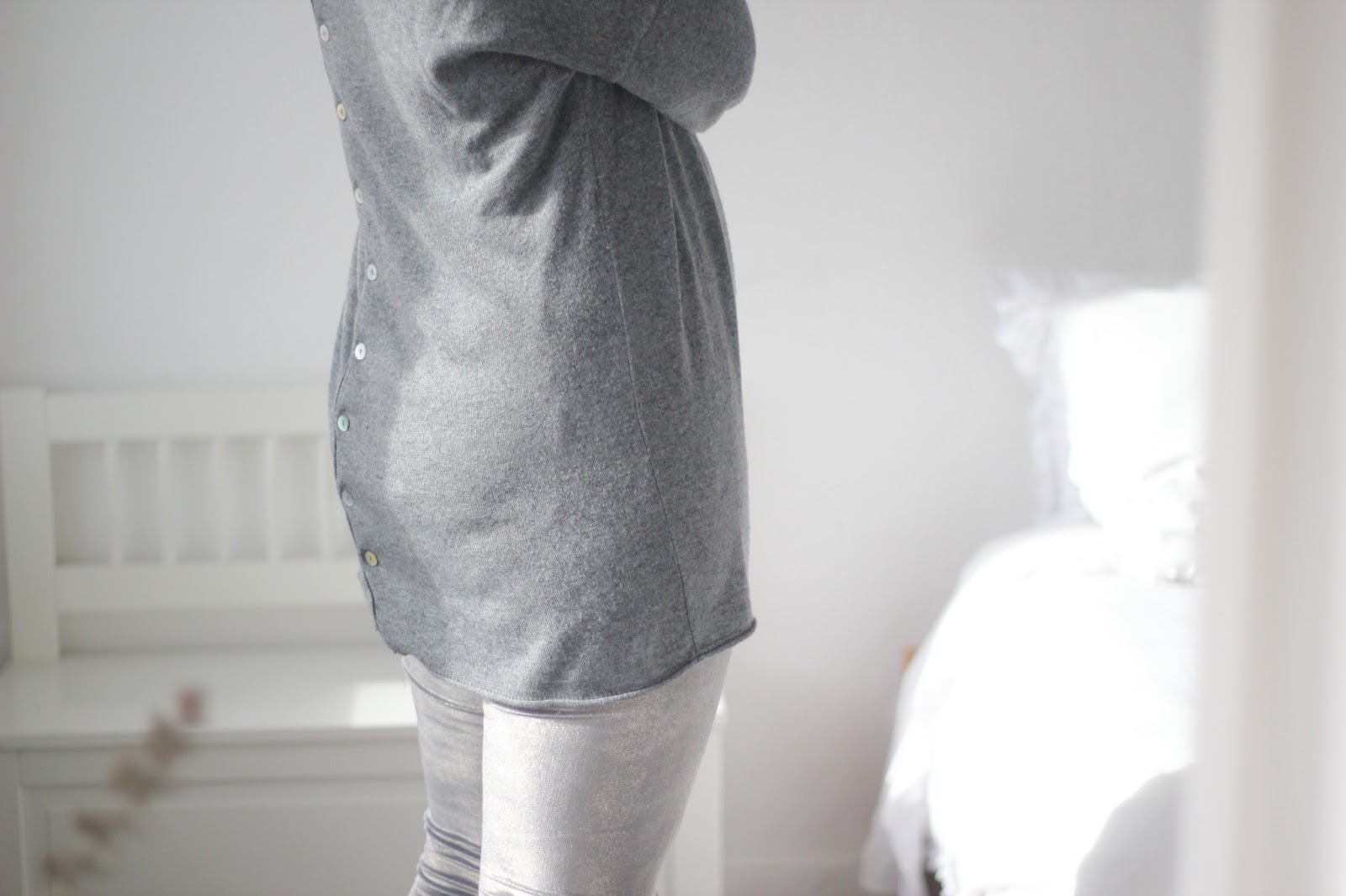 Arrisquei e trouxe para ela e para mim sem sequer experimentar, daí a excitação e a felicidade quando coube dentro delas. Umas calças com brilho que não ficaram too much para usar de dia, porque foram combinadas com básicos cinzentos sem mais nenhum acessório.
