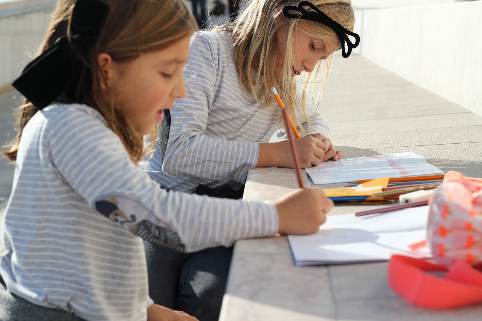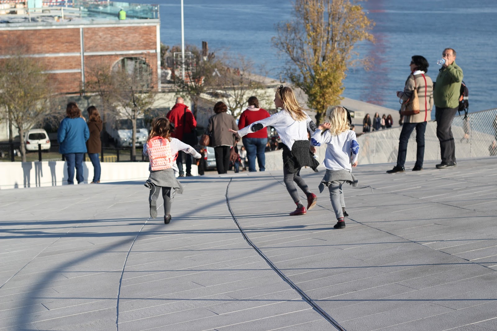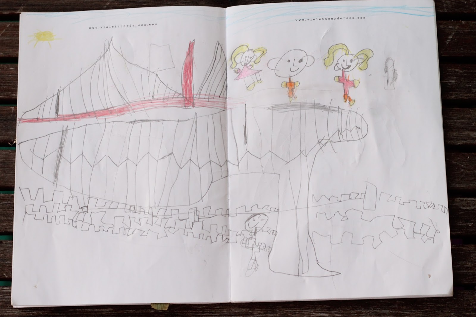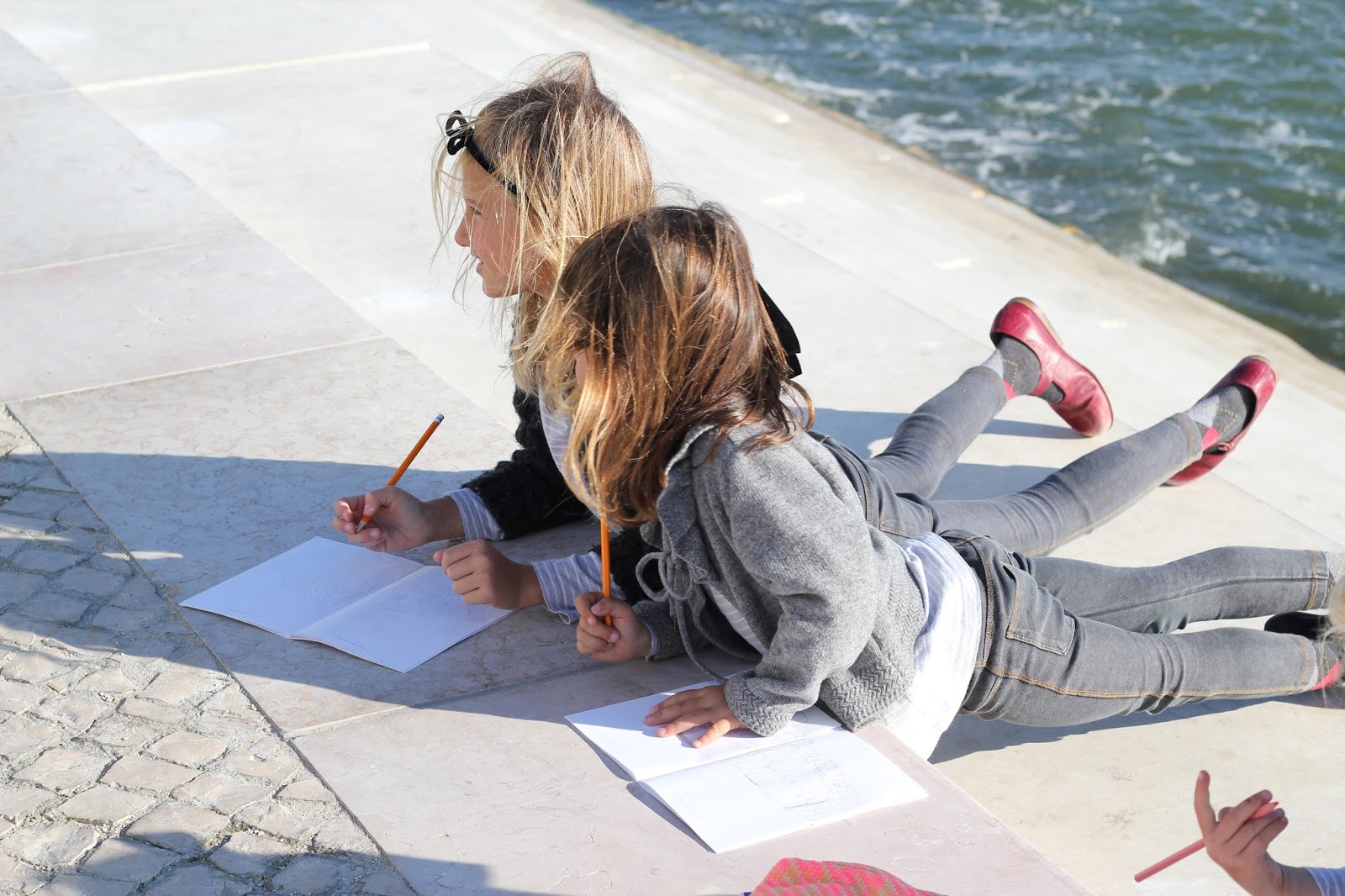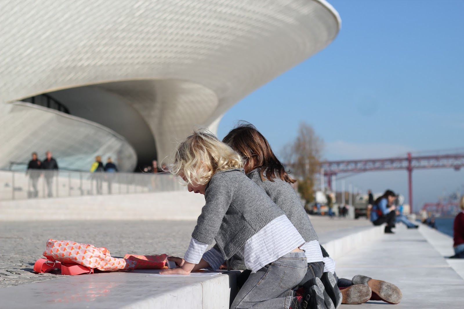 Hoje foram desenhar o MAAT. Pegámos nos cadernos (os das explorações da Violeta cor de rosa que estão quase cheios das muitas aventuras que acham dignas de registos), no lápis de carvão, afia, borracha, nos lápis de cores e fomos para lá. Cada uma desenhou o que achou importante para mostrar o que os seus olhos viam e mais gostavam naquela paisagem, sendo o museu a figura principal.