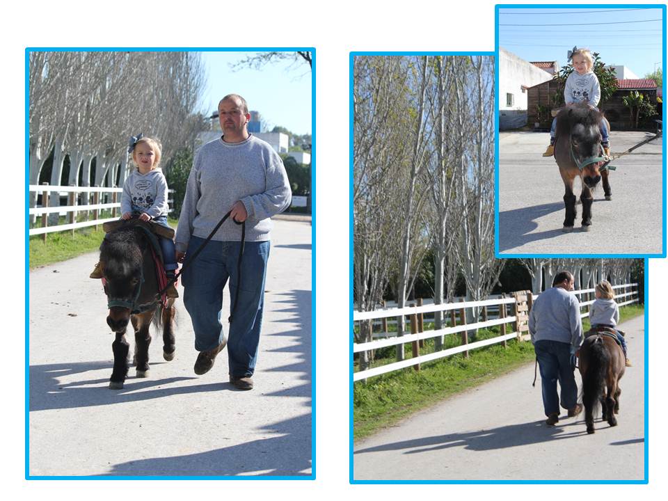 Mas antes da festa eu e o H. fizemos-lhe uma surpresa e levámos a C. a dar o seu 1º passeio a cavalo..quer dizer de pónei. Que giro que foi, ela adorou (eu já aqui disse que a C. adora cavalos) e não teve medo nenhum…o preço é óptimo, falem com o Sr. Mário (91 763 42 64)! A Maria Pompom é um pónei amoroso, muito dócil e que faz passeios tanto no Jokey do Campo Grande como, vejam só o máximo, pode ir fazer passeios fora, ou seja se quiser pode tê-la na festa de anos do seu filho em casa (claro que essa alternativa é para quem tenha ou arranje casa com um jardim).