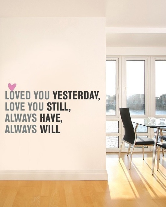 Gosto muito de frases giras espalhadas pela casa, aqui está uma que teria com todo o gosto e que não é assim tão difícil de fazer (talvez de todas desta lista seja a mais fácil mesmo), basta falar com a Hom3 e voilá, uma parede que não nos faz esquecer o quanto gosto de ti (eu não sou fã do dia dos namorados, aliás é um dia que sempre me irritou, mas para quem gosta e não sabe como surpreender a sua cara metade é uma óptima sugestão de presente).