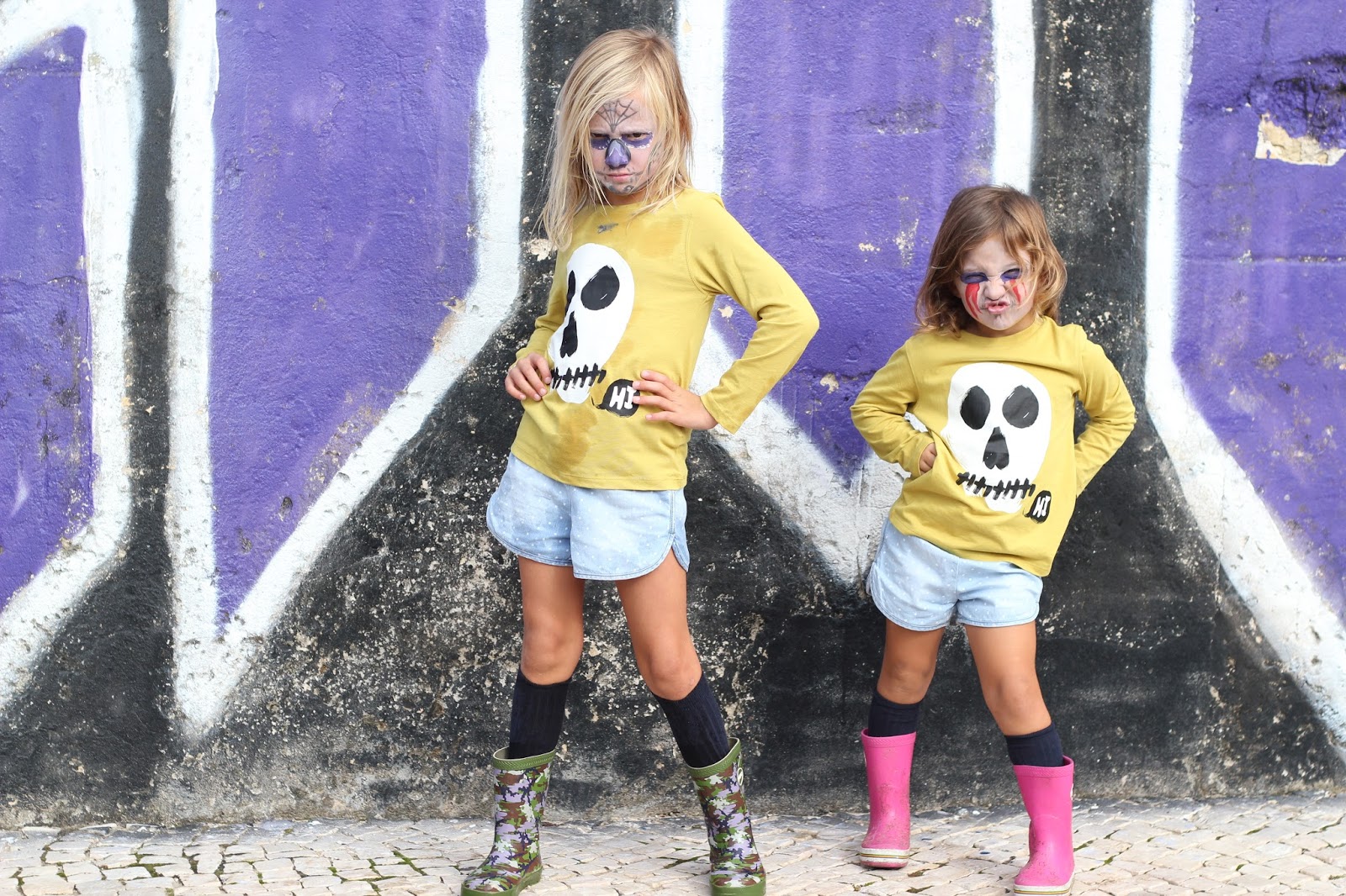 – Mas oh mãe, isto não mete medo nenhum!!!! Qual é a graça? Nós queríamos era um daqueles fatos inteiros dos esqueletos (que por acaso até havia na H&M e eu quando olhei pensei que elas nunca iriam usar tal coisa). Valeu o pai, que ao telefone deu logo a ideia de ir à net ver pinturas assustadoras e horrorosas, para lhes fazer na cara, que com isso iam logo ficar muito mais contentes. E não é que ficaram?