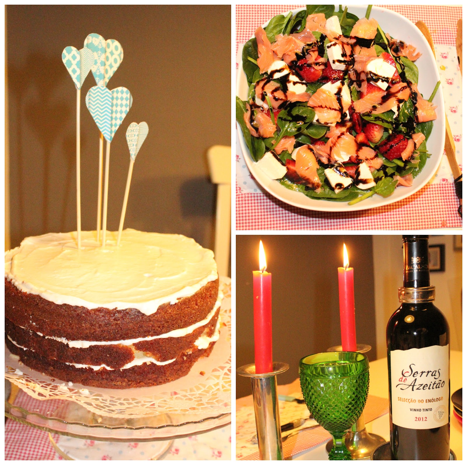 Para o jantar, a última surpresa, um bolo delicioso que pedi à Ana da Bake4you, uma salada de salmão, morangos e queijo mozzarela, inspiração do Pinterest e claro um copo de vinho porque a ocasião merecia um Tchim.tchim.