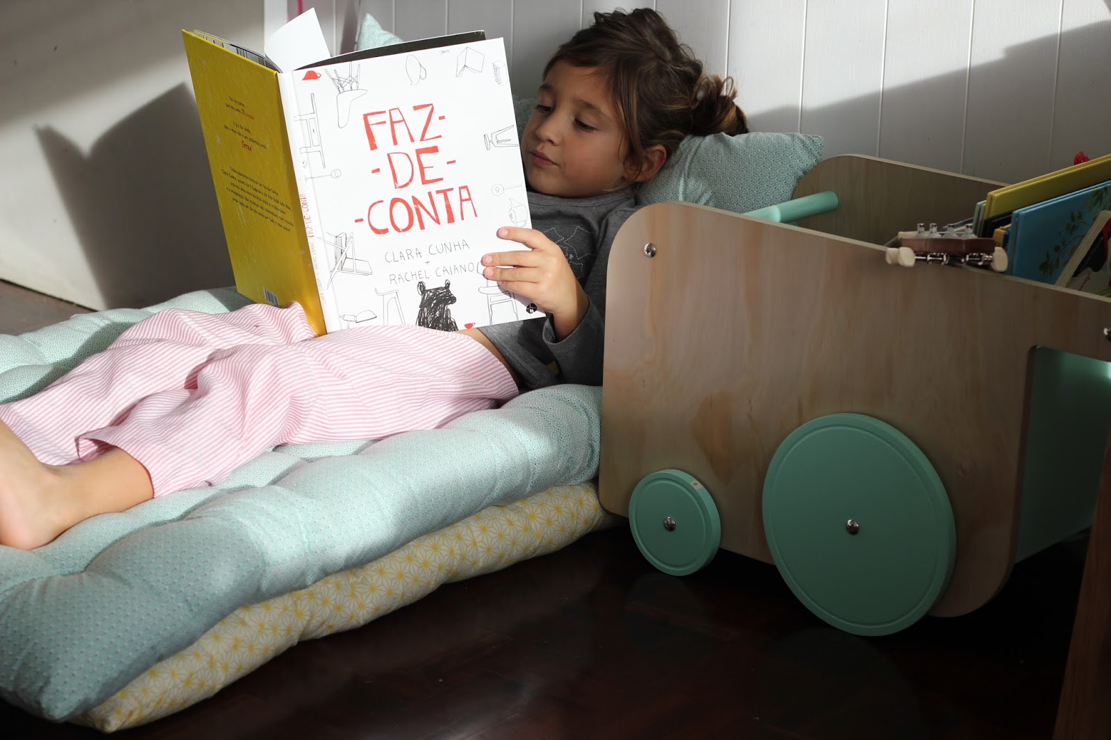 O cesto antigo com os livros foi substituído pelo carrinho, que é o máximo e elas adoraram. Ao lado, dois colchões LINDOS para quando lhes apetecer ler e ver as histórias que todas gostam tanto.