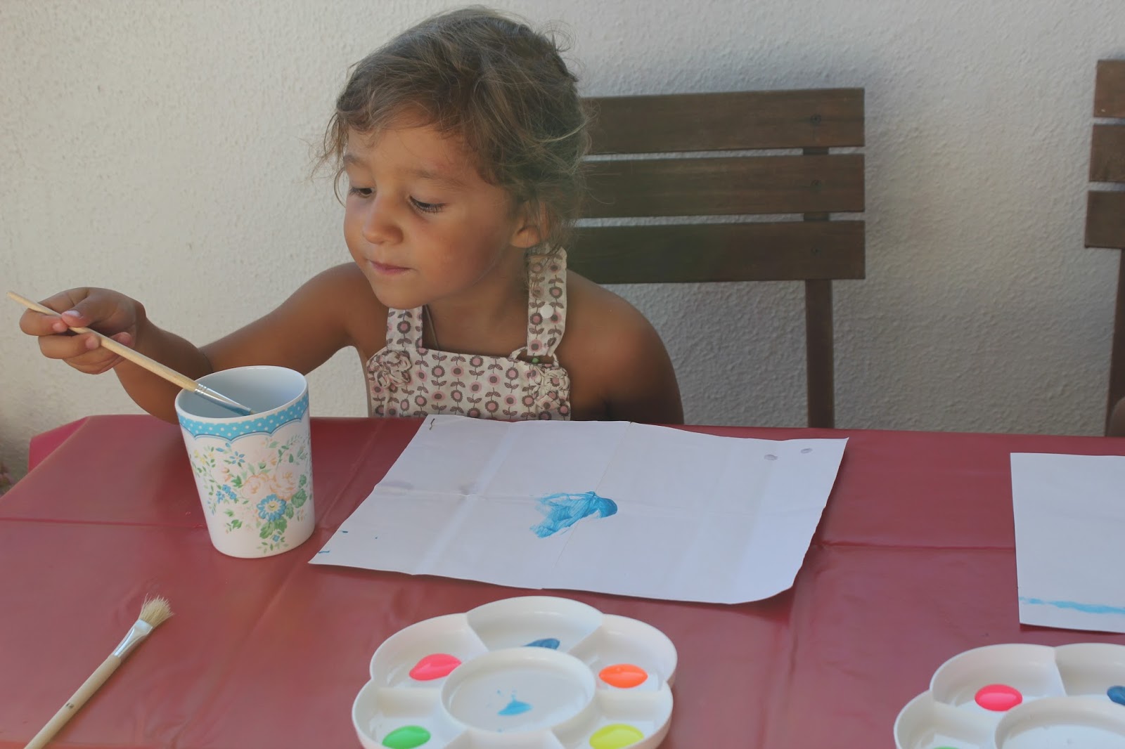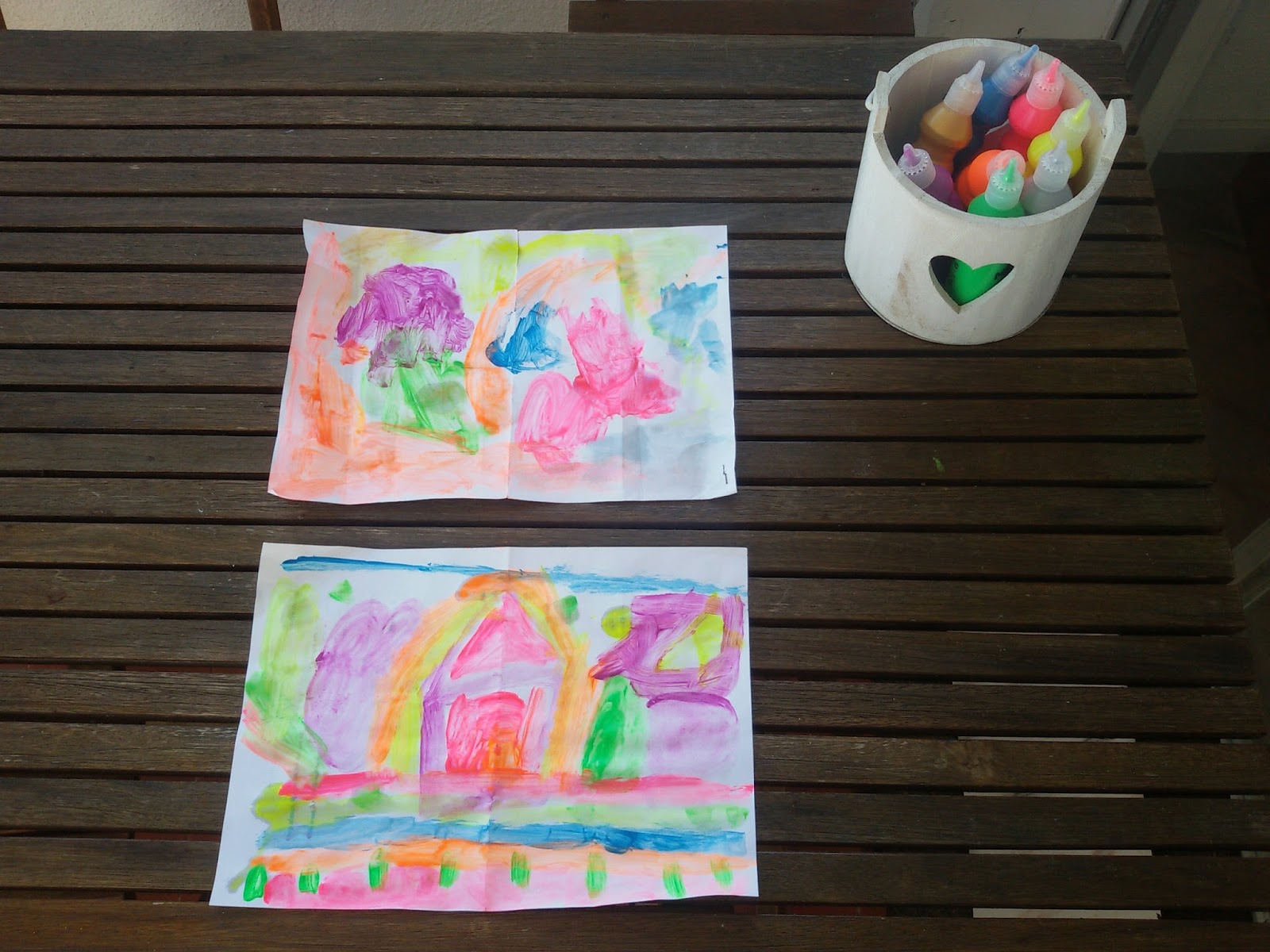 As pinturas com aguarelas foi das que mais gritos de excitação consegui delas e os sorrisos de felicidade com este programa valeram o trabalho de conseguir que as 3 não acabassem pintadas da cabeça aos pés, e claro, que sofás, mesa e roupas também não.