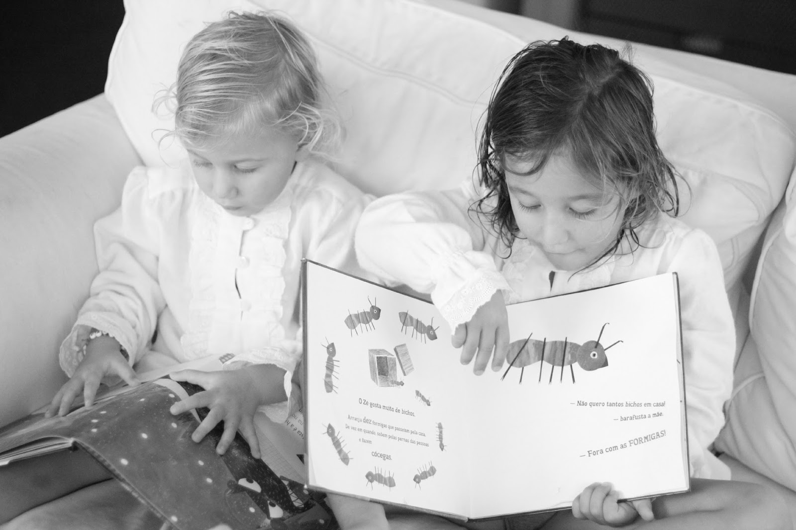 A Carlota, que está no 1º ano, já começa a querer juntar as sílabas, a ler as palavras e as frases, como se fosse muito crescida. A Concha tenta imitar e a Caetana é de todas a mais atenta, na hora de irem escolher um conto para eu ler antes de irem para a cama.