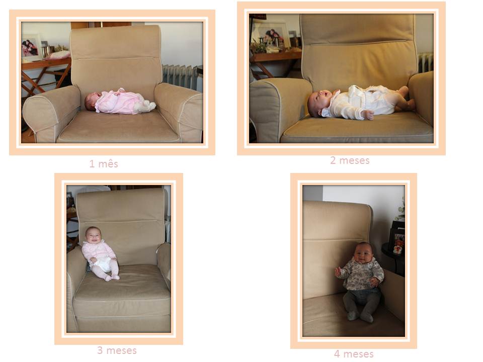 pss – …numa das minhas visitas diárias por blogs que vejo um pouco de todo o lado, adorei a ideia de tirar todos os meses durante um ano uma foto á C. pequenina, sempre no mesmo cadeirão para ir registando a sua evolução (confesso que não está exactamente como eu queria…mas aqui fica a ideia)…o resultado final será ter os 12 meses do 1º ano dos nossos bébes assim…e porque ontem fez 4 meses foi dia de foto…