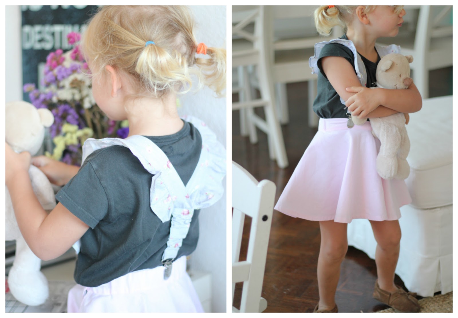 Adorei, a saia cor de rosa com os suspensórios (tem dois para poder trocar) desta colecção de Verão e adorei como ficou com a t-shirt preta que não tem nada a ver.