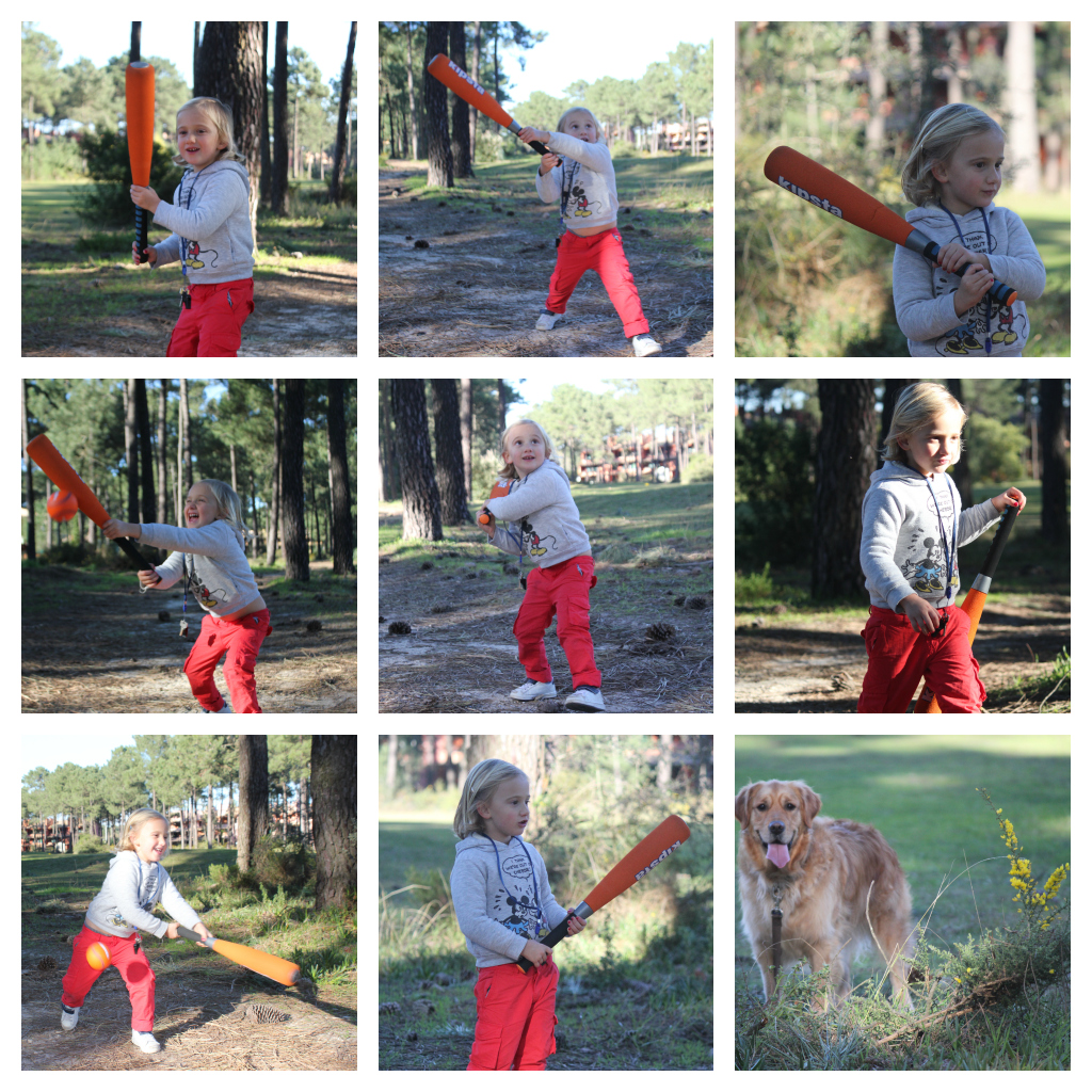 O pai, que já percebeu que o melhor é mesmo ir ensinando brincadeiras de rapaz às miúdas que tem, lá foi buscar o gadjet de baseball para umas lições ao ar livre. Um dos filmes preferidos da C. grande é o Kiko o pequeno herói, um filme de baseball com tacos e bolas falantes, por isso estava radiante a achar-se a estrela do filme.